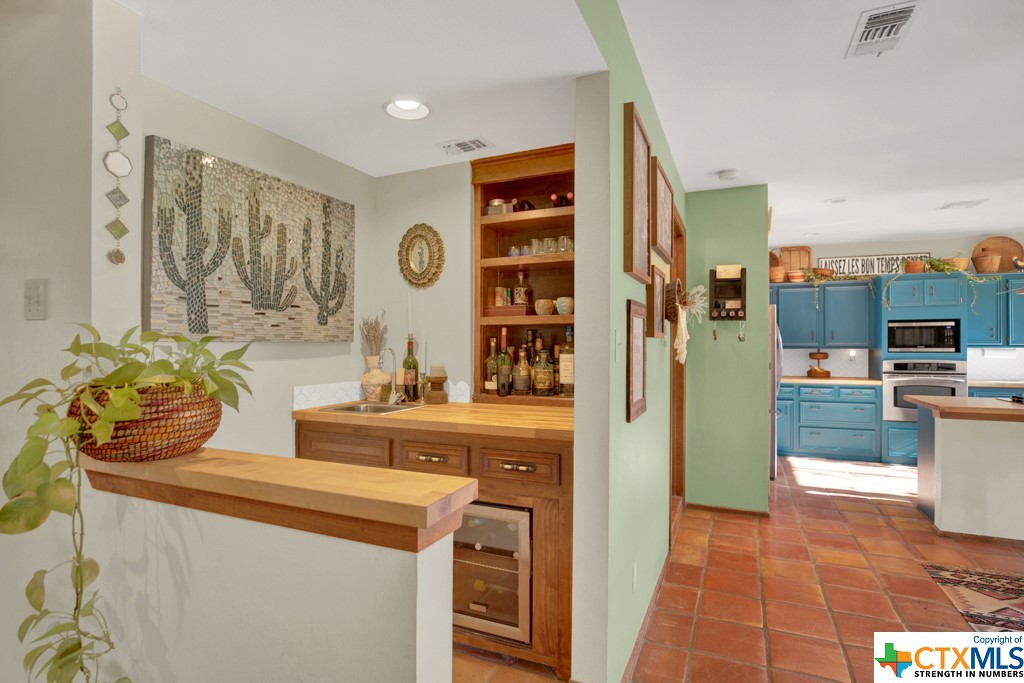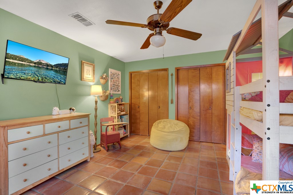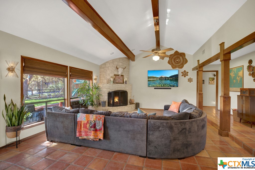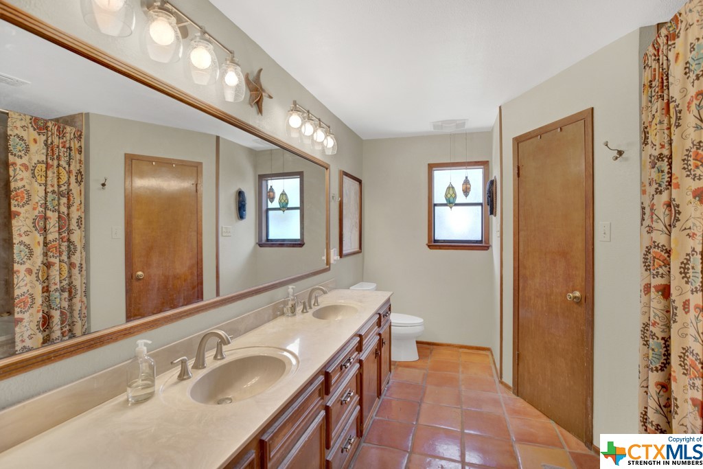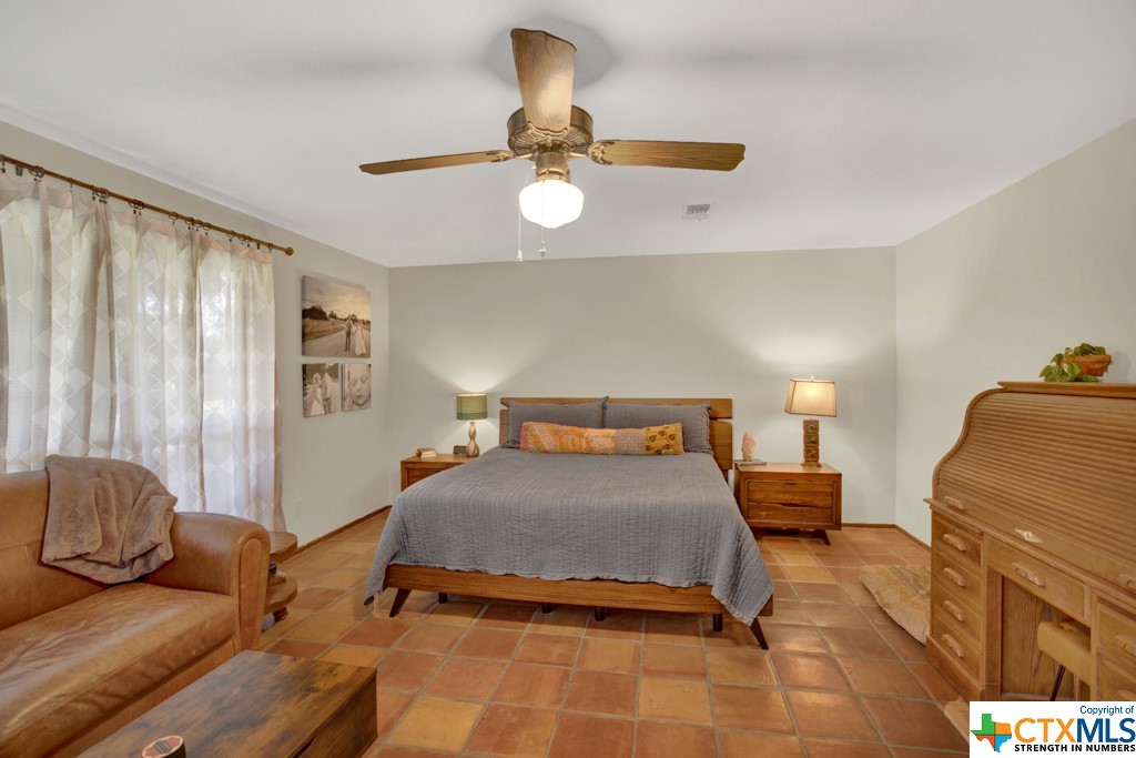 **MOTIVATED SELLERS** Prepare to be enchanted by this meticulously cared for 2-bedroom, 2.5-bathroom haven. From the moment you step inside, the soaring ceilings of the spacious living area, bathed in natural light and adorned with a charming masonry fireplace, beckon you in. The kitchen is a chef's dream, boasting exquisite cabinetry, ample storage, built-in appliances, and expansive windows that bathe the space in warmth. Throughout the home, Saltillo tiles add a touch of timeless elegance. The primary bedroom is a sanctuary, offering outdoor access, his and her closets, and dual vanities in the en-suite bathroom. Meanwhile, the secondary bedroom boasts generous closet space, large windows, and ceiling fans for added comfort.